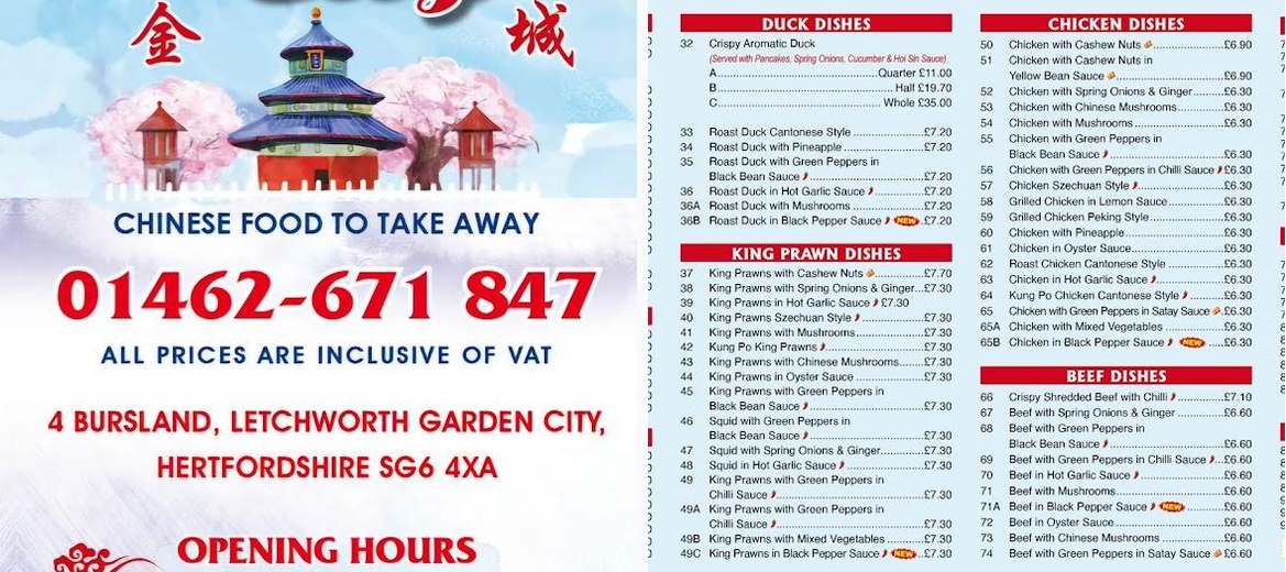 Welcome to Golden City, your premier destination for authentic Chinese cuisine in Letchworth Garden City. Located at 4 Bursland, our cozy restaurant offers a delightful menu featuring favorites like aromatic crispy duck and tender beef in oyster sauce, all served piping hot. Enjoy the friendly service with options for takeaway or dine-in, complete with wheelchair-accessible seating. With a casual atmosphere and attentive staff eager to remember your orders, Golden City is the perfect spot for a hearty meal. Plan your visit today, and don’t forget to bring cash for your delicious Chinese takeaway experience!The most-loved dishes at Golden City include the aromatic crispy duck, known for its enticing crispy skin and tender meat that melts in the mouth. Customers rave about the beef in oyster sauce, which consistently impresses with its rich flavors. The recently added salt and pepper chicken wings have caught attention, featuring four different flavors that deliver an unforgettable taste. Guests appreciate the friendly service, with staff remembered by name and order, making patrons feel valued. The vibrant atmosphere, combined with the amazing flavors, creates an inviting space that keeps diners returning.